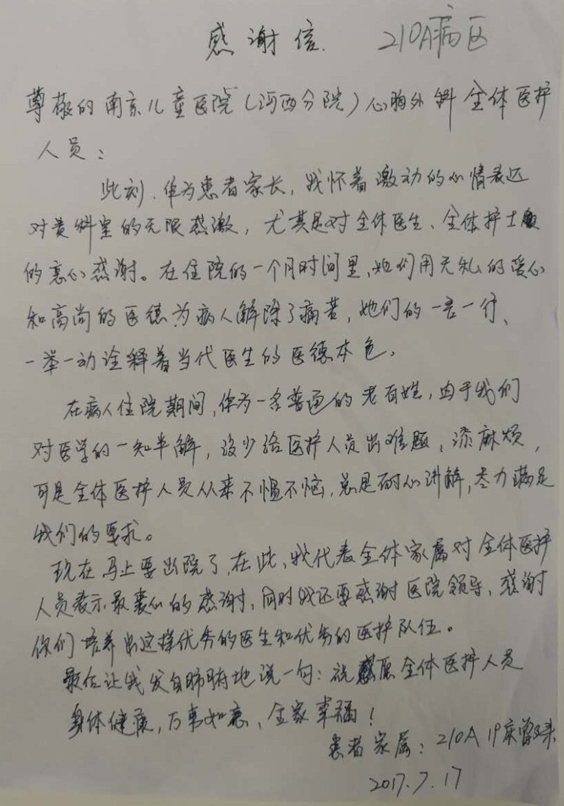 此刻,作为患者家长,我怀着激动的心情表达对贵科室的无限感激,尤其是全体医生、全体护士的衷心感谢。