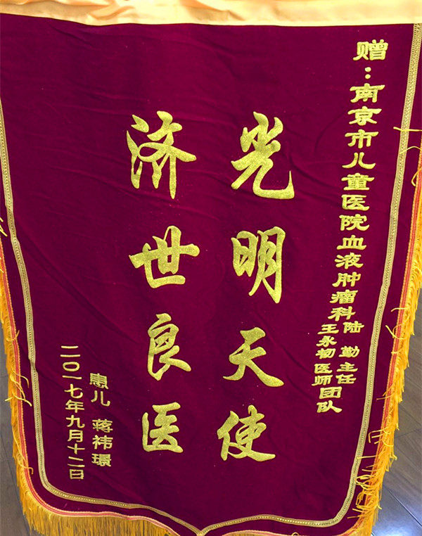 赠:皇冠信用盘(中国)官方网站 血液肿瘤科陆勤主任 王永韧医师 团队光明天使 济世良医患儿 蒋袆璟二〇一七年九月十二日