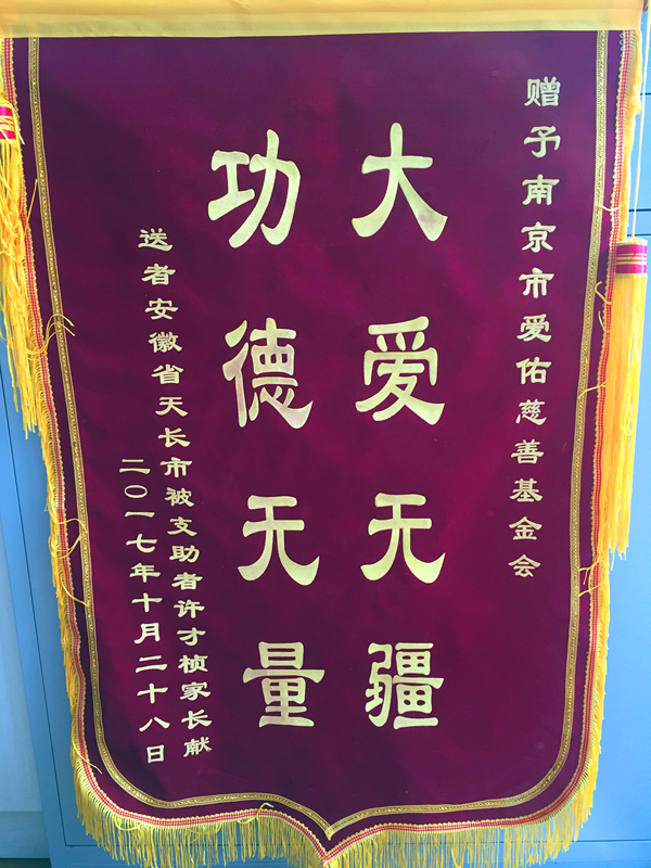 赠予南京市爱佑慈善基金会大爱无疆 功德无量送者安徽省天长市被支助者许才桢家长献二〇一七年十月二十八日