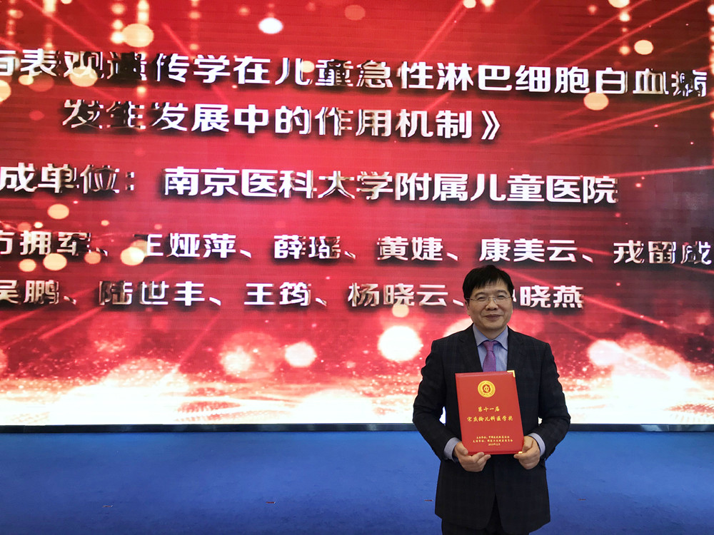 凭借“遗传与表观遗传学在儿童急性淋巴细胞白血病发生发展中的作用机制”项目荣获儿科医学奖,血液肿瘤科方拥军教授及项目主要负责人薛瑶医生接受颁奖。