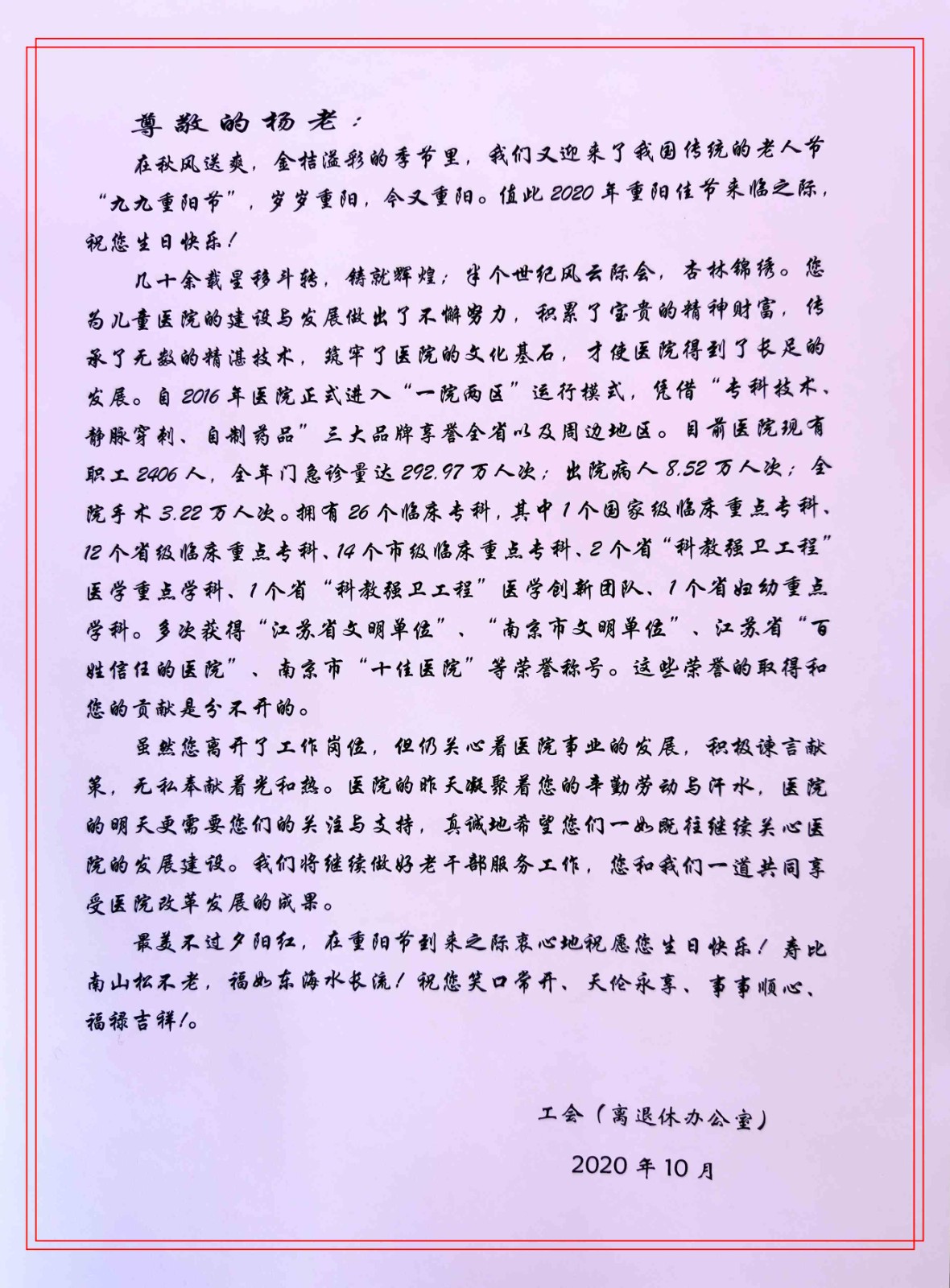 重阳节前夕,院工会和离退休办公室工作人员带着皇冠信用盘 全体干部职工的深切祝福,对皇冠信用盘(中国)官方网站 年满90岁和100岁的10位离退休职工进行祝寿走访慰问,并为每位老同志送上了鲜花、祝寿信和慰问金。对年满70岁和80岁的59位退休职工以邮寄祝寿信和蛋糕券的形式进行祝寿慰问。尊老敬老是中华民族的传统美德,此次活动让离退休老同志感受到了皇冠信用盘 浓浓的关爱和温暖,他们纷纷表示对组织的衷心感谢,愿继续发挥余热,为皇冠信用盘 的发展献计献策。祝愿全体离退休老同志健康长寿、生活幸福!